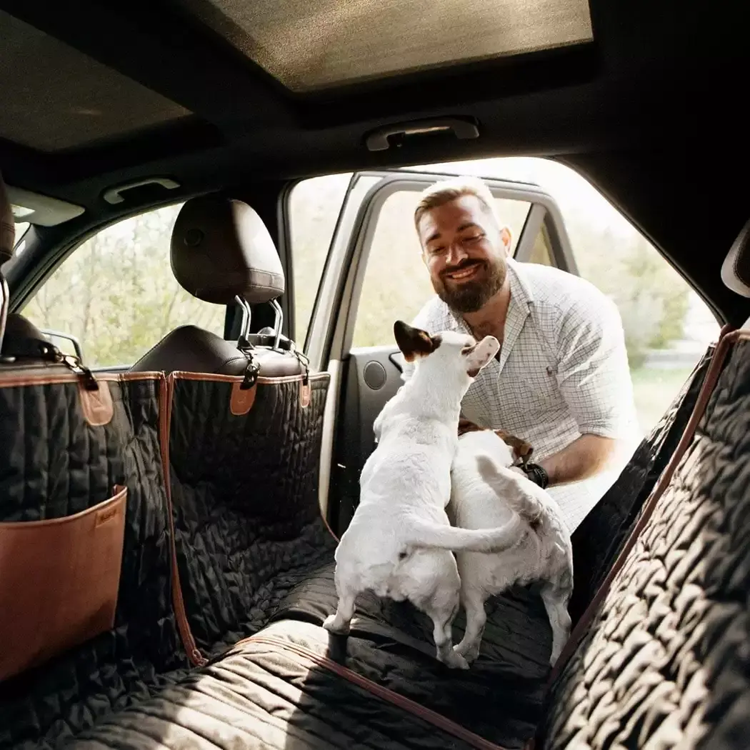 I love this dog hammock, I got a new car and my dog absolutely loves to ride. With leather seats, I was afraid he would tear up the seats with his nails. This dog hammock fit perfectly in the back seat, allowing my dog enough room to enjoy the car rides while also protecting the leather. It is machine washable so when it gets dirty, you just throw it in the wash.