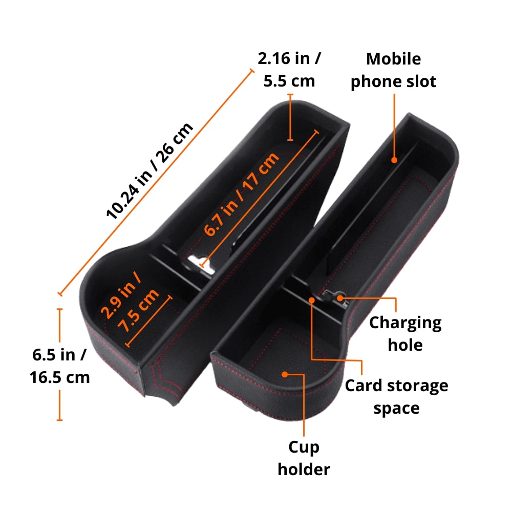 Crafted with quality PU Leather, designed to universally fit and add extra style to any vehicle. No more painfully shoving your hand in the gaps between your seat and center console or dangerously fishing around your center compartment while driving. Our organizer fits right in that infamous seat-center console gap so items no longer go missing. Instead, you can keep everything sturdily in place — and within arm’s reach — from your phone to drink to sanitizer and spare coins. Premium Car Seat Organizers are the perfect way to keep yourself organized on the go.
